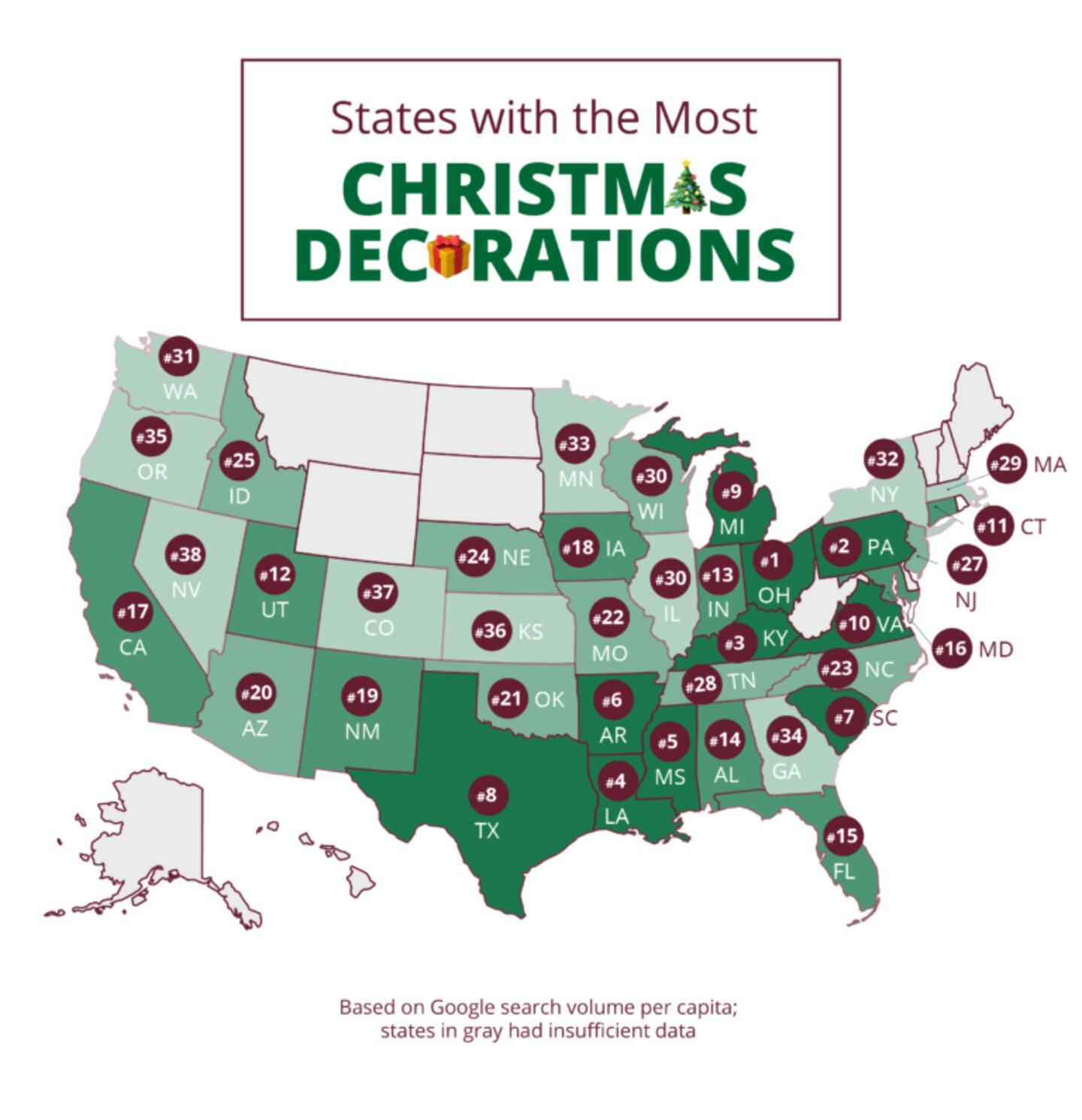 Which state was rated having the most holiday decorations? Oklahoma comes in at 21. Neighboring states, Arkansas and Texas made the top 10. Ohio is the number one state with the most holiday decor!