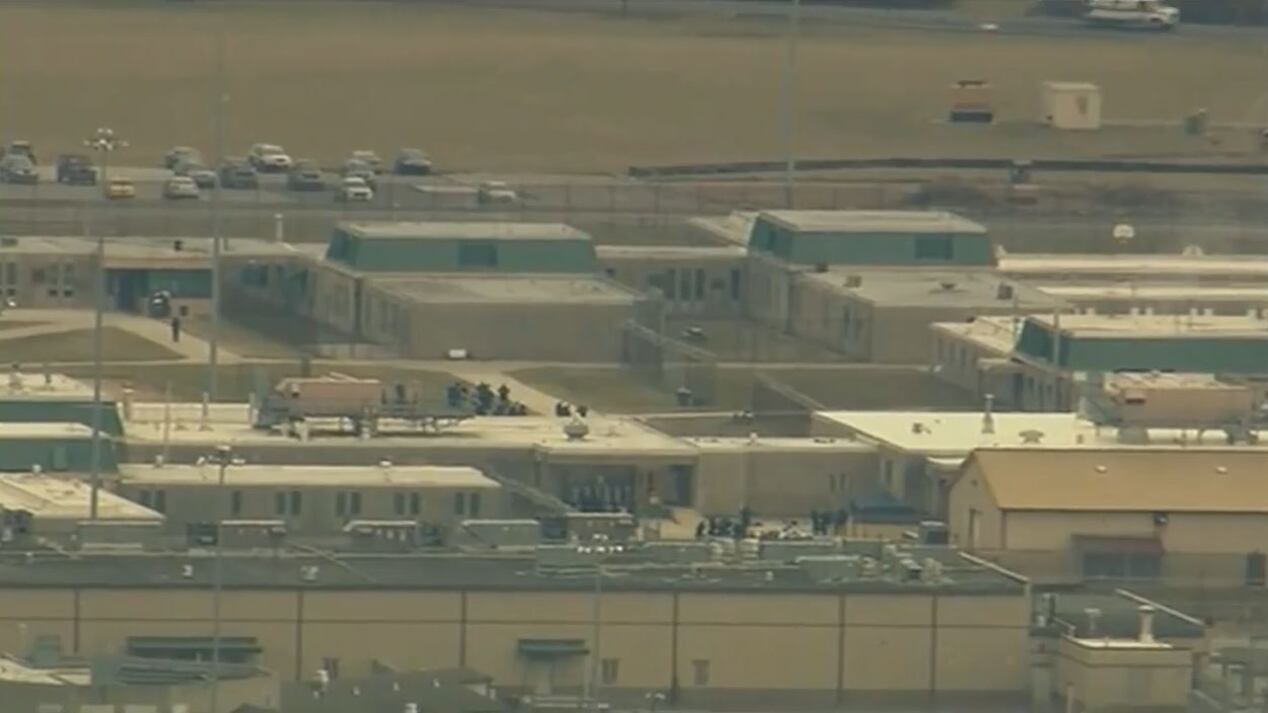 Video from above the prison showed uniformed officers gathered in two groups along fences near an entrance to the prison. Later, video showed several people surrounding a stretcher and running as they pushed it across the compound. It wasn't clear if a person was on the stretcher. People could be seen standing near a set of doors with an empty stretcher and wheelchair.