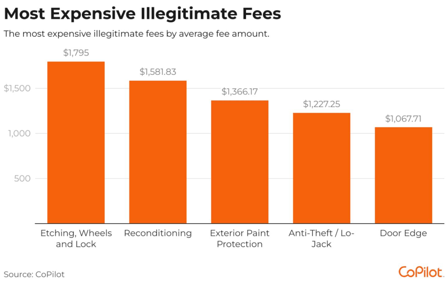 The illegitimate fees below fall into a few categories. They can include charges for added features that were pre-installed on the vehicle, but are not included in the final purchase price to the consumer. They can also refer to extra features that the dealer added to the car during the purchase process, without asking the consumer.