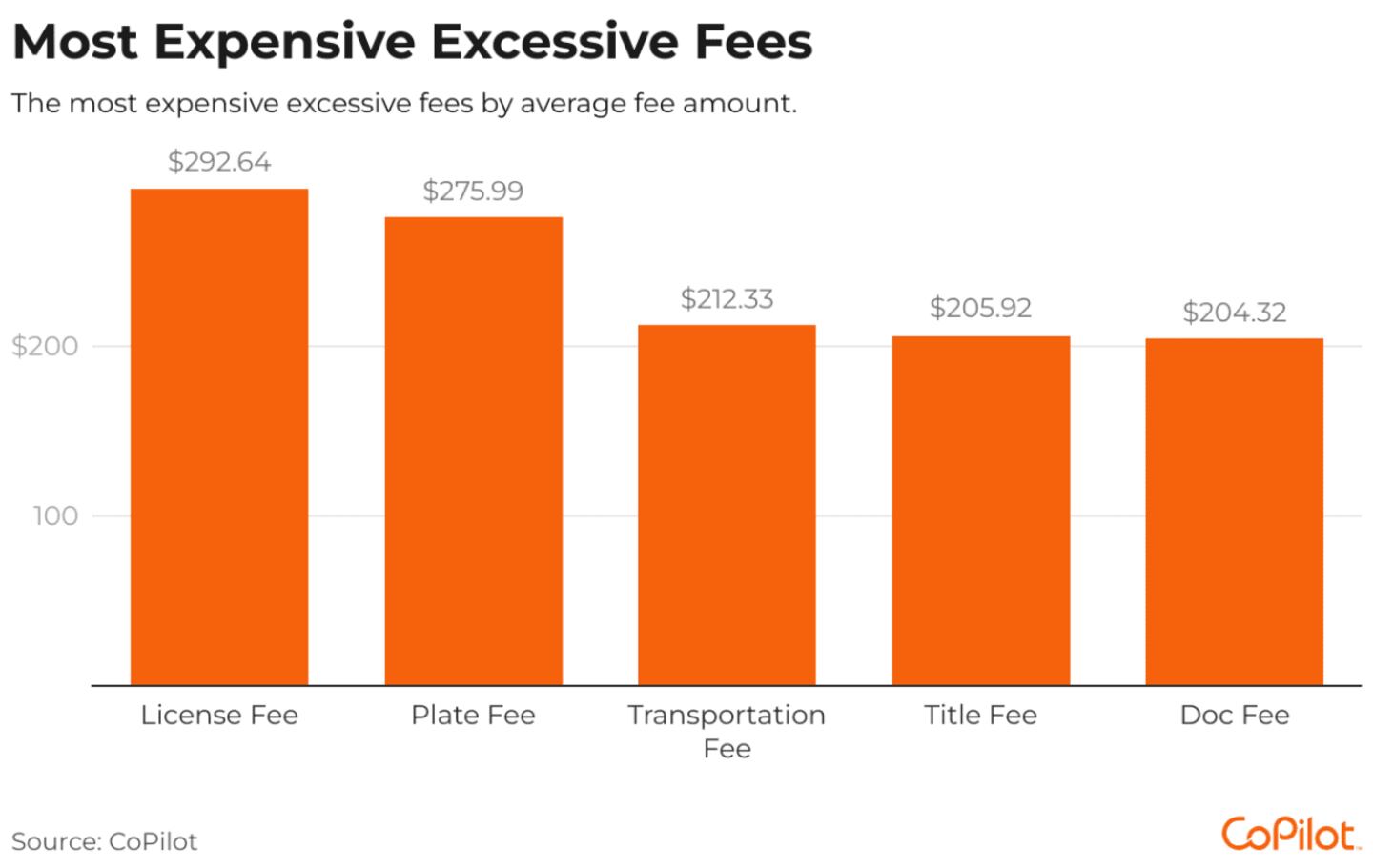 - The amount in license fees that dealers are allowed to charge is capped by the state and should not exceed a certain amount. This number is the average amount by which license fees exceeded the state limit in the used car purchases analyzed by CoPilot.