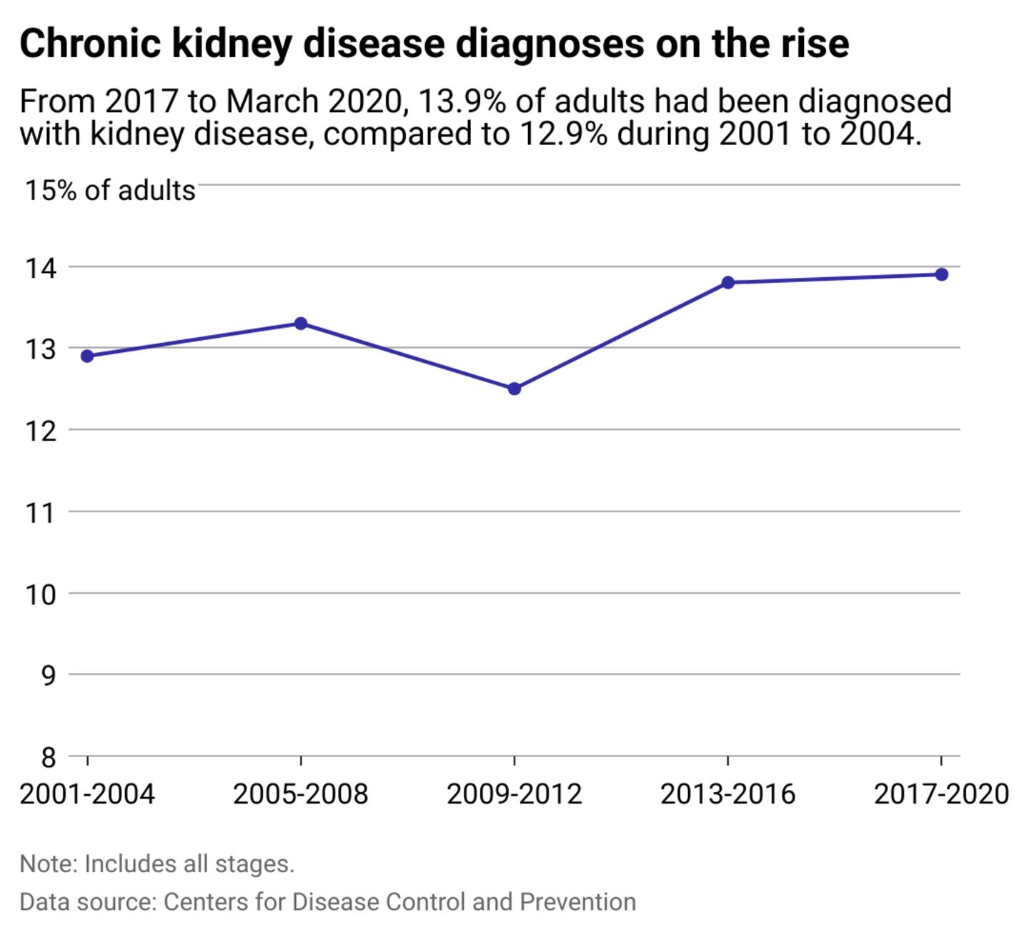 The prevalence of kidney disease has been steadily increasing. According to the CDC, the percentage of American adults with CKD rose from 12.9% between 2001 and 2004 to 13.9% between 2017 and March 2020.