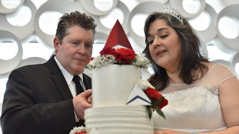 During the ceremony, officiant Gabriel Bugarin, who works with Lora at Delta, announced: “If anyone objects to this marriage, find the nearest exit. It’s sometimes behind you.”