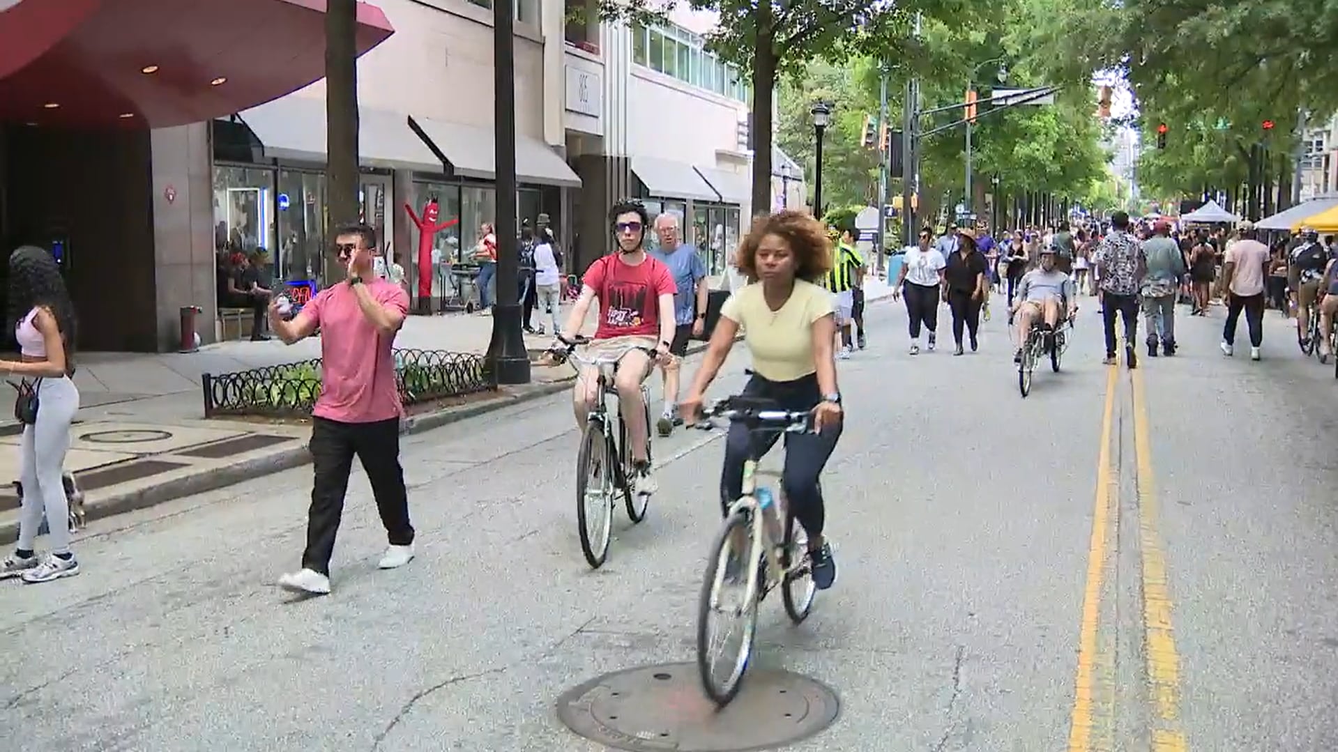 ATLANTA — Peachtree Street in Midtown Atlanta is closed to motor vehicles for several hours today as pedestrians, bicyclists, skaters, dancers, and more enjoy another Atlanta Streets Alive event.