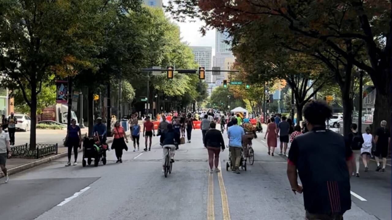About three miles of Peachtree Street are closed to vehicles and the street is taken over by pedestrians, bicyclists, roller skaters, joggers, etc.