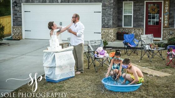 The couple got local company Sole Photography to do a "drive-by" photoshoot and held the ceremony in their yard, complete with a the TP cake, stuffed animals for guests and a kiddie pool as their own private beach.