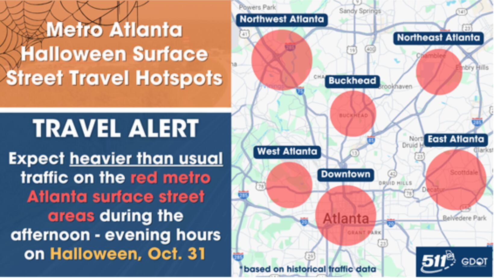 - Plan – Expect increased traffic on your usual route during Halloween night. Utilize the 511GA app to explore alternative routes.