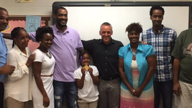 Jacobi went to Woodson Park Academy Monday to show his medal to the group of first-graders and teach them about the Olympics.
