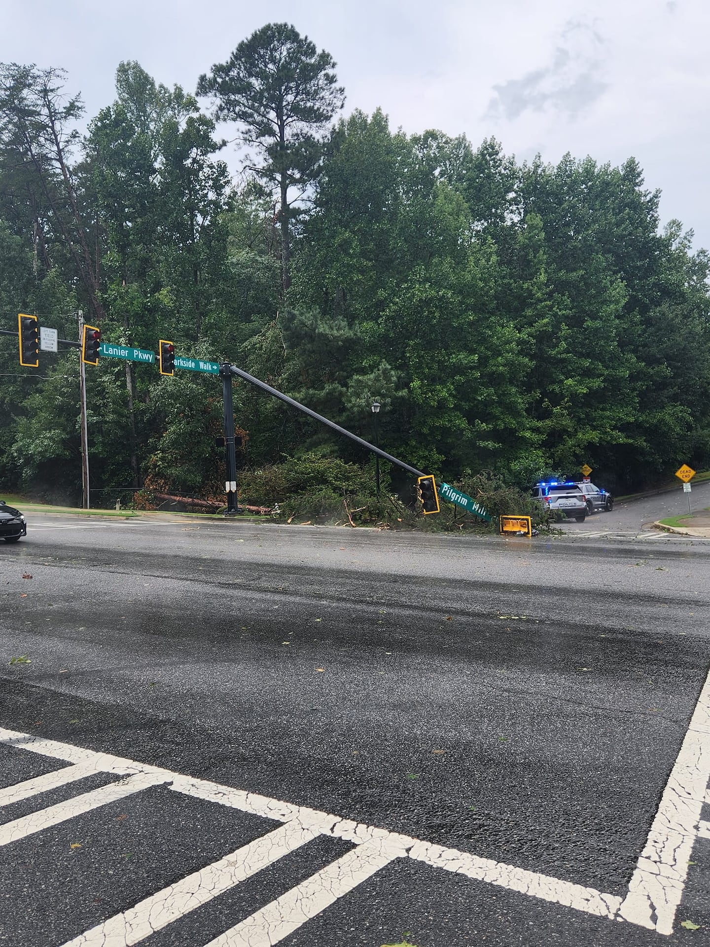 The arm that supports traffic lights at the intersection of Lanier Parkway and Pilgrim Mill Road in Cumming was knocked into the intersection by storms.
