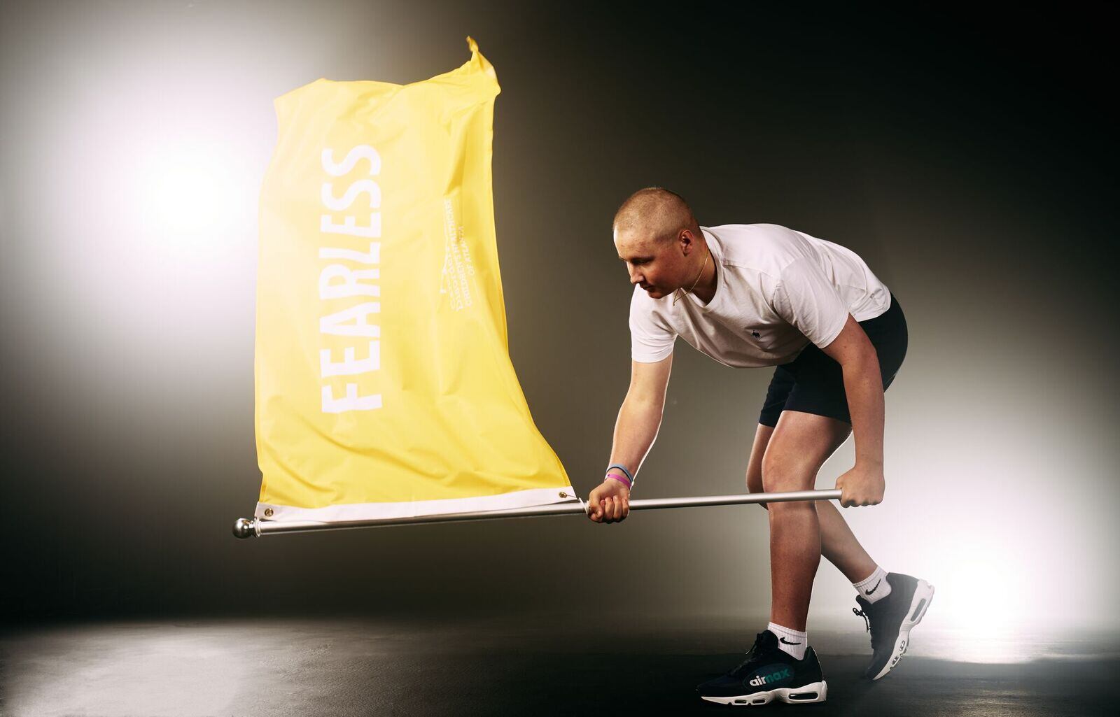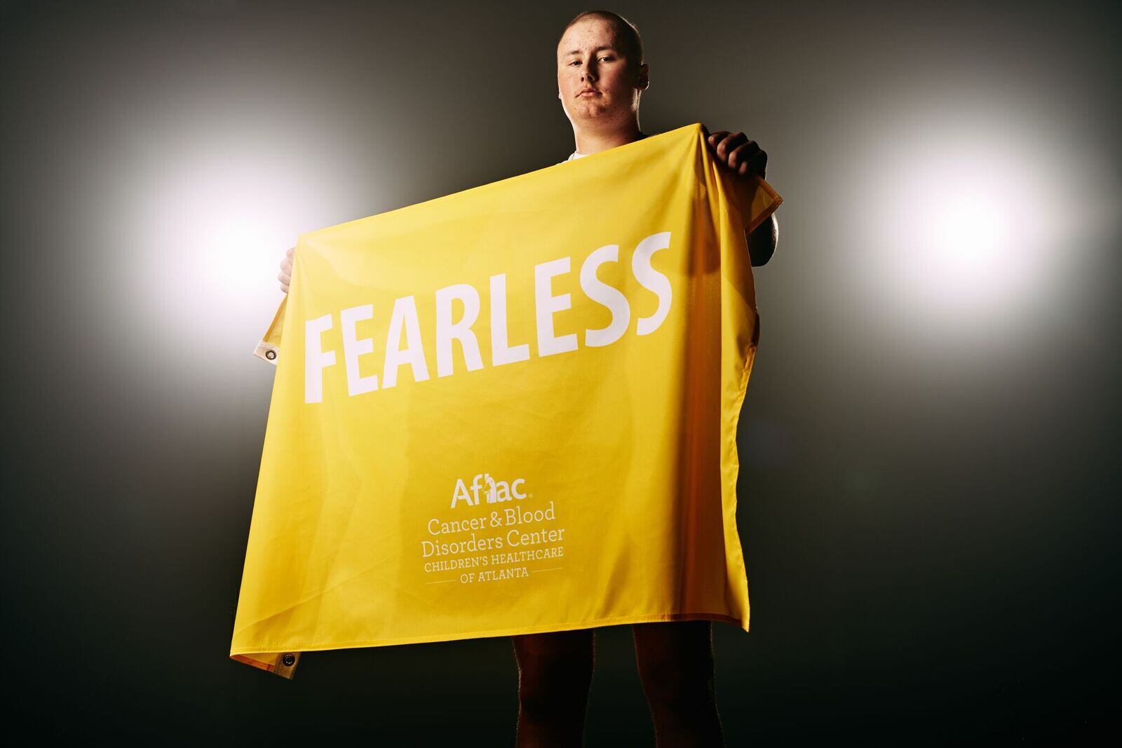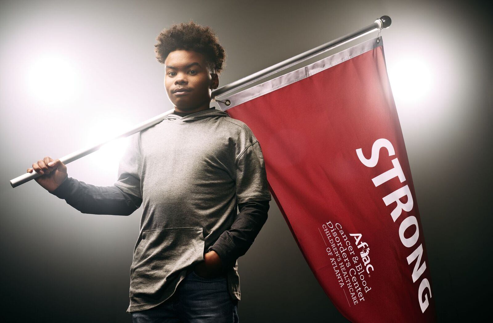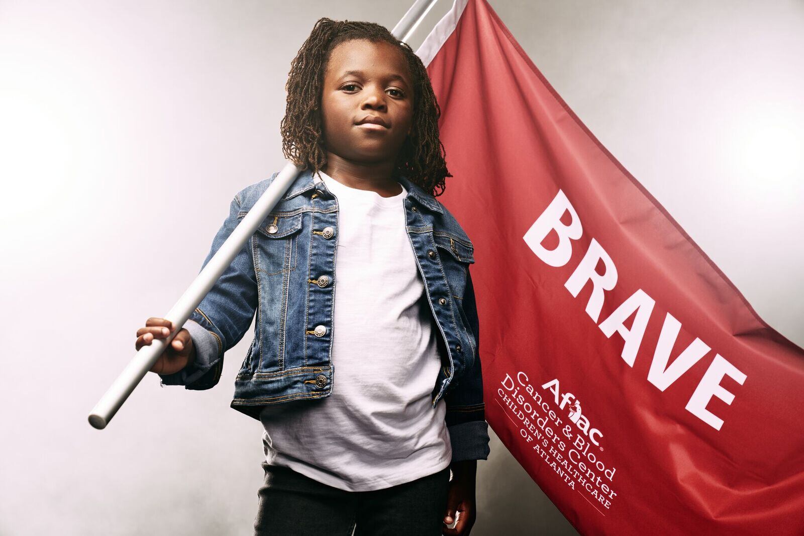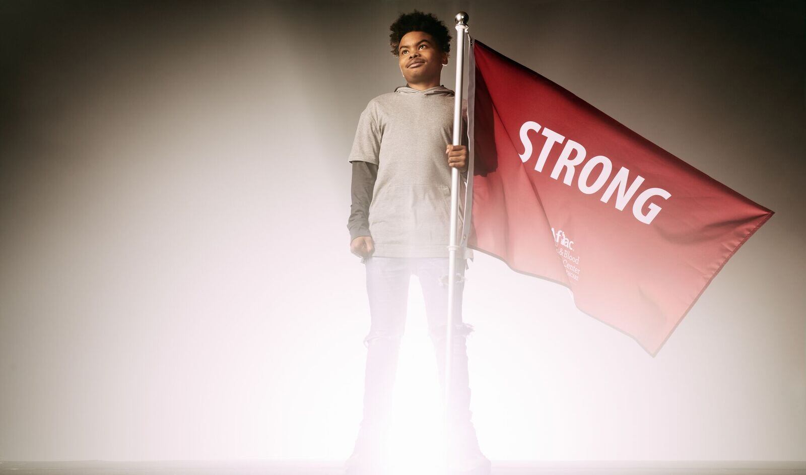 The patients, ranging in age from 4 to 15, picked one word they use to define themselves. They pose with powerful flags -- gold representing cancer, burgundy representing sickle cell.
