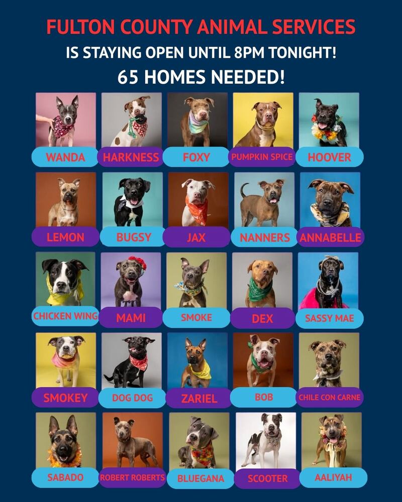 As of Thursday evening, DeKalb’s shelter had 19 dogs who need adopters or fosters by 8 p.m., while Fulton’s had 20 dogs.