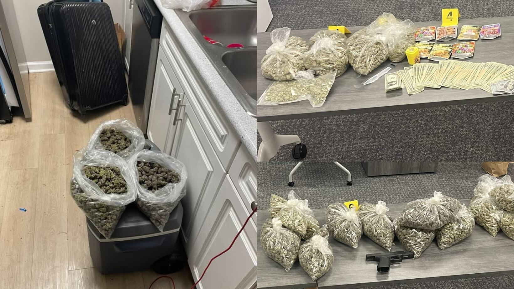 The identities, and location, of the suspects were not immediately available. Police said all four were charged with trafficking marijuana, possession with intent to distribute Percocet and multiple firearm-related offenses.