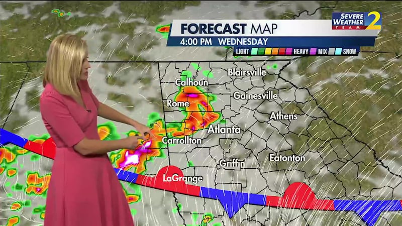 ATLANTA, Ga. — A line of severe storms knocked out power and toppled trees Wednesday afternoon across the southern parts of the metro Atlanta area.