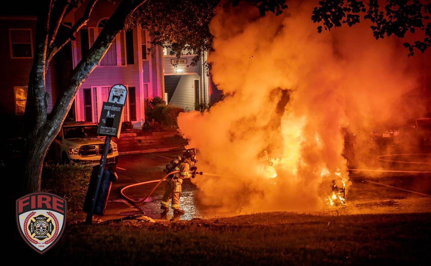 Alpharetta firefighters were called to car fire at the Manchester at Mansell Apartments on Huntington Drive just before 2 a.m. Thursday morning.