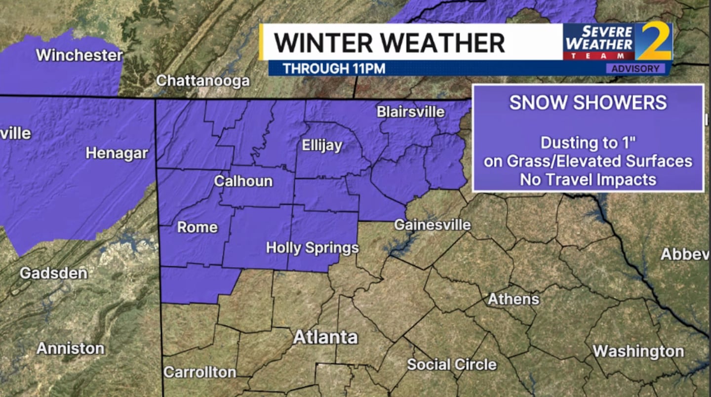 As cold air catches up to lingering moisture, rain showers will change to mix and snow showers, especially north and west of Atlanta. Nitz says light accumulation on grassy surfaces up to 1” are possible.