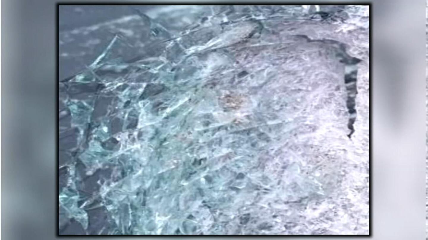 Pictures show several vehicles with shattered windshields damaged by someone throwing rocks.