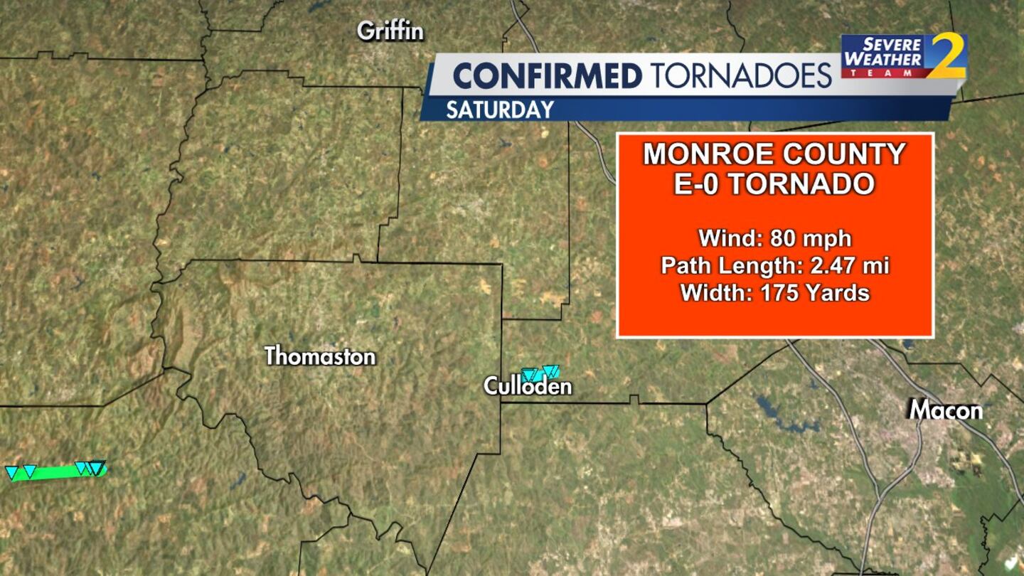 The NWS previously confirmed that two EF-0 tornadoes touched down in Newton and Monroe counties, while an EF-1 tornado touched down in Talbot County.