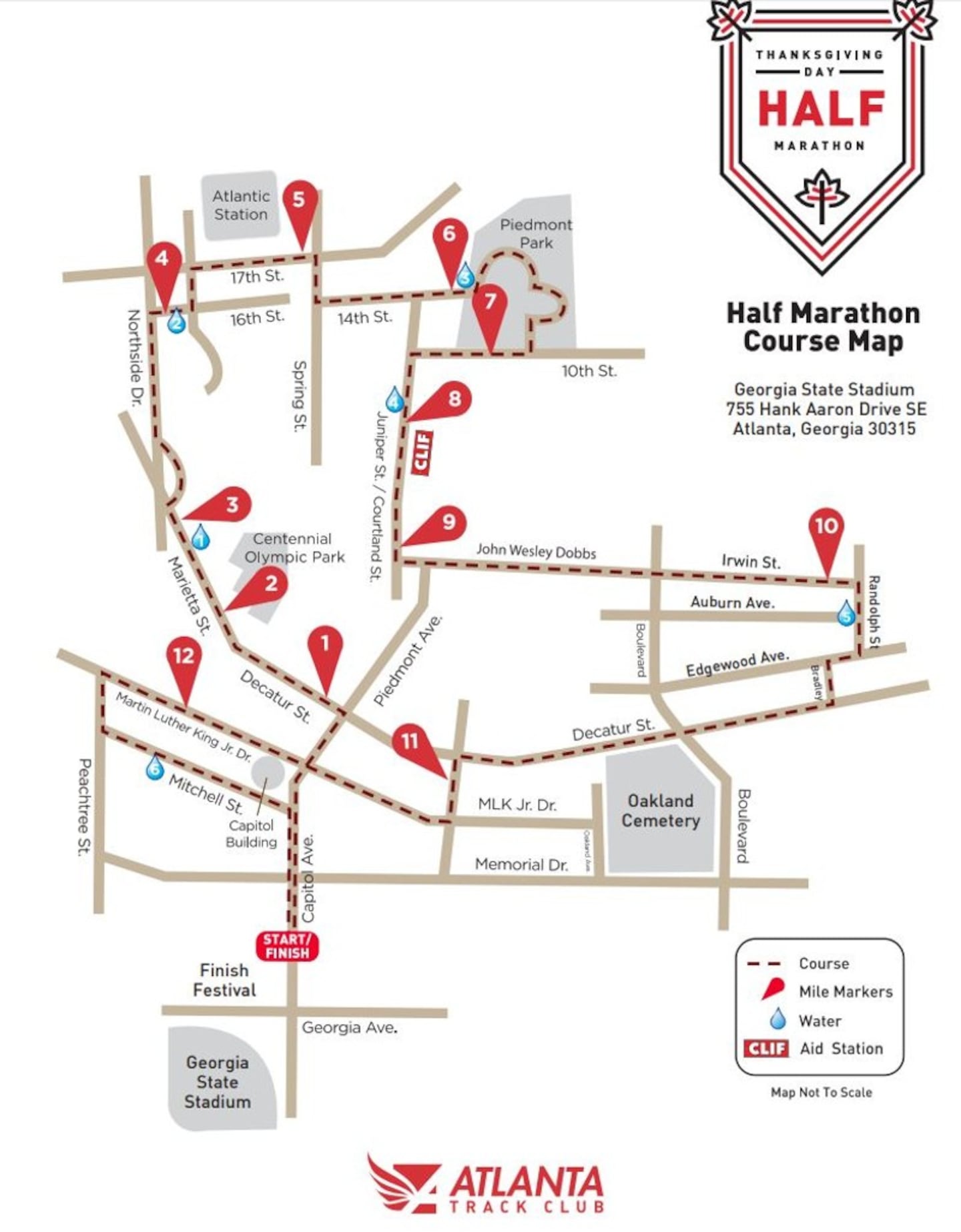 The half marathon began near the Georgia State Stadium (formerly Turner Field) and passed by attractions such as Atlantic Station, Piedmont Park and Oakland Cemetery.
