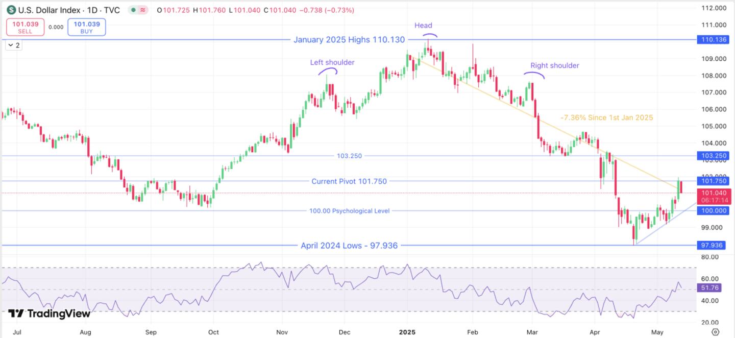 A further breakdown led to a swifter slump, which stopped at a measured move from the neckline, on Liberation Day at 101.27. There was a continuation of this move as the index found a bottom at 97.94 on April 21, 2025.