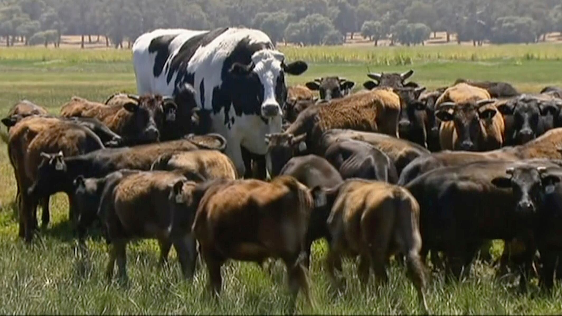 The black-and-white Holstein Friesian won social media fame and many proclamations of "Holy Cow!" after photos surfaced of the 194-centimeter (6-foot-4-inch) steer standing head and shoulders above a herd of brown wagyu cattle in Western Australia state.