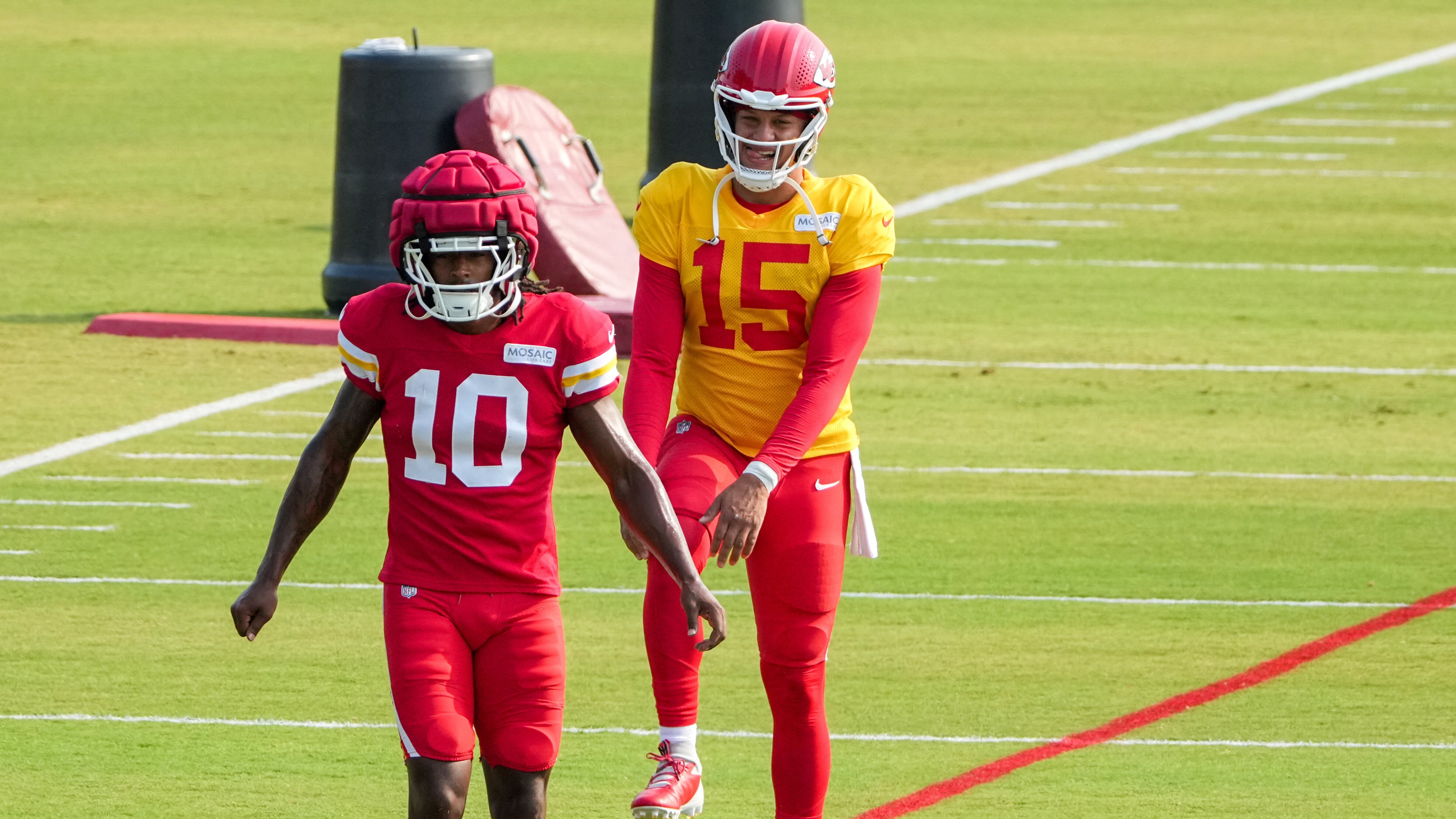 NFL: Kansas City Chiefs Training Camp Jul 26, 2024; Kansas City, MO, USA; Kansas City Chiefs running back Isiah Pacheco (10) and quarterback Patrick Mahomes (15) stretch on field during training camp at Missouri Western State University. Mandatory Credit: Denny Medley-USA TODAY Sports (Denny Medley/USA TODAY Sports via Reuters Con)