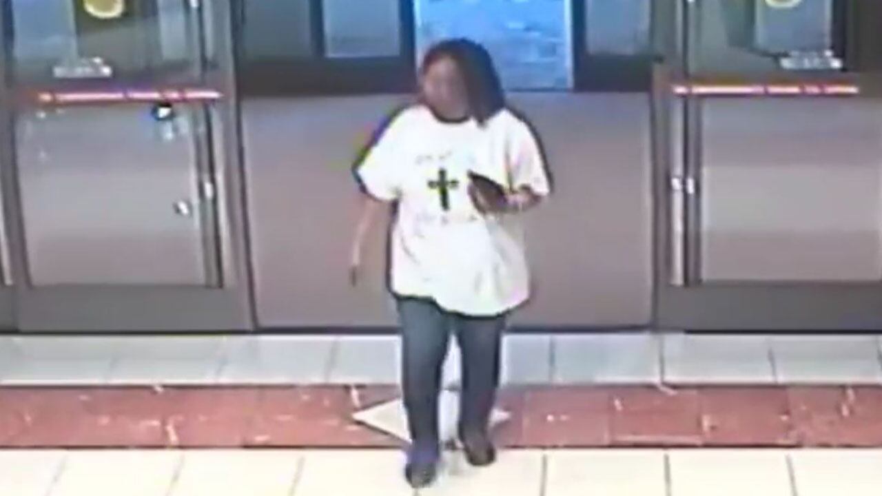 PELHAM, Alabama — Police are searching for a woman seen wearing a cross on her shirt after they say someone’s credit cards were stolen and then used in a shopping spree.