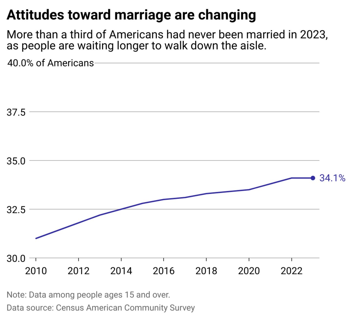 That's according to a 2023 report by the Pew Research Center, which analyzed Census Bureau data to reveal that a record-high share of Americans over 40 have never been married. One in 4 40-year-olds had never tied the knot as of 2021, up from 1 in 5 in 2010.