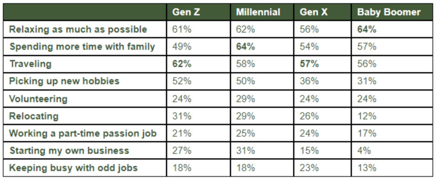 Notably, retirement wishes vary by generation, with Gen Z and Gen X most interested in traveling, millennials prioritizing time with family, and Baby Boomers planning to rest easy: