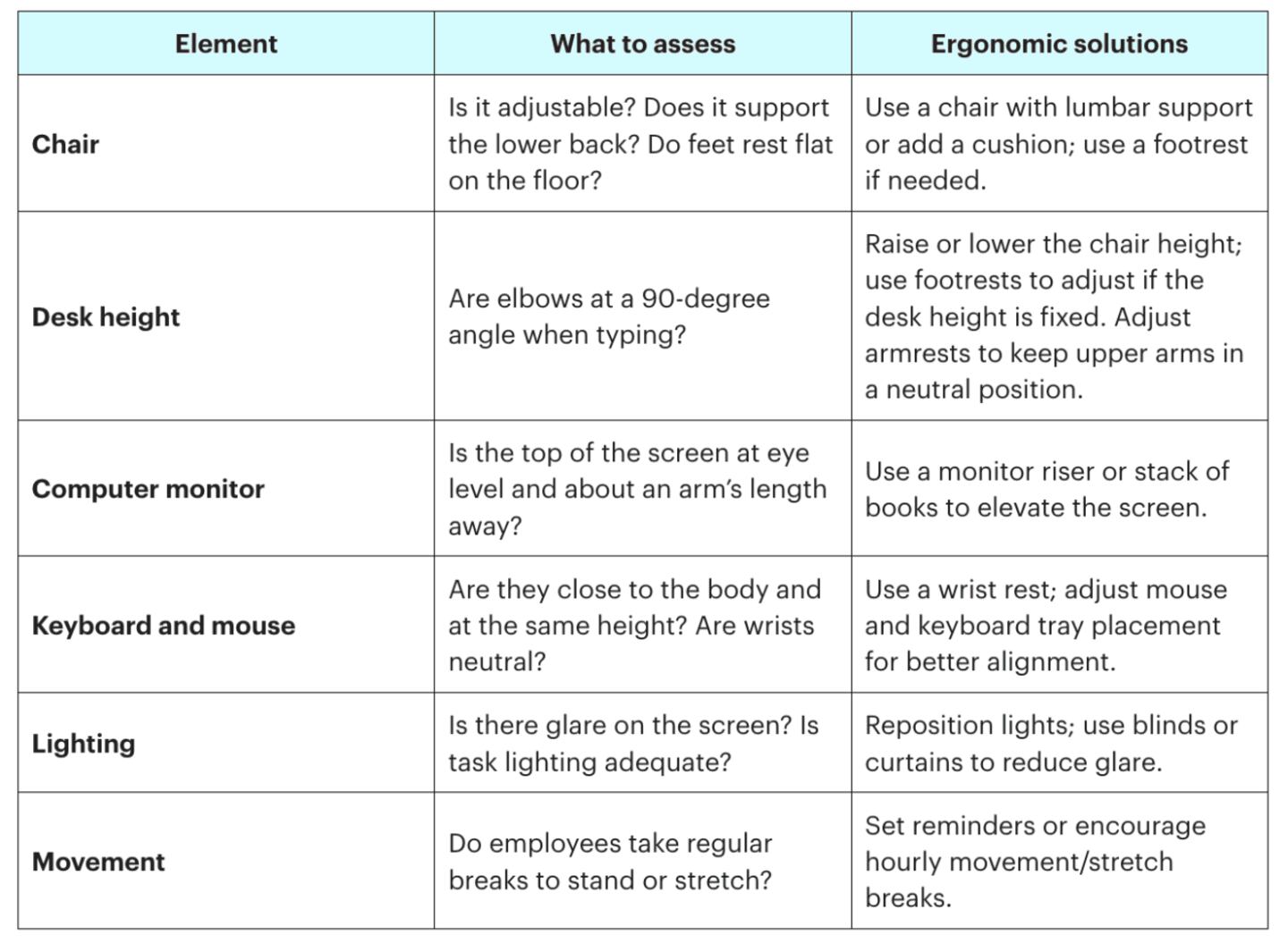- Make ergonomics part of onboarding: Include a simple ergonomics checklist in your new hire materials, whether your team is in-office or remote.