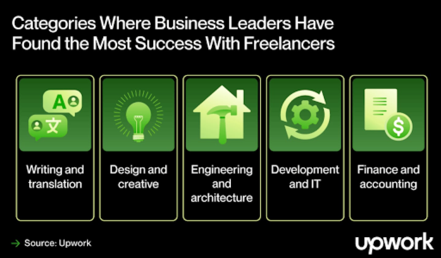 Finance and accounting work, such as bookkeeping, reporting, and forecasting, were also on the list of top categories where leaders are already successfully working with freelancers.