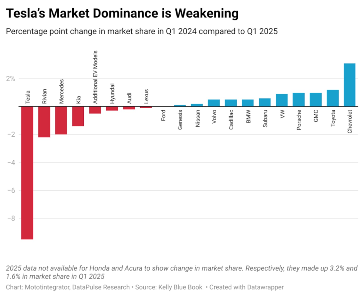 Tesla’s grip on the U.S. EV market is loosening. In Q1 2025, its market share fell to 43.2%, down from 52.7% the previous year—a 9.5-point decline. No other automaker came close to this level of loss. While Tesla lost ground, Chevrolet gained 3.1 points, Toyota and Porsche each climbed by more than 1 point, and other brands like GMC, VW, and Subaru made notable gains.