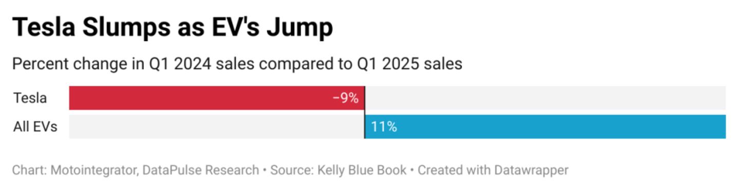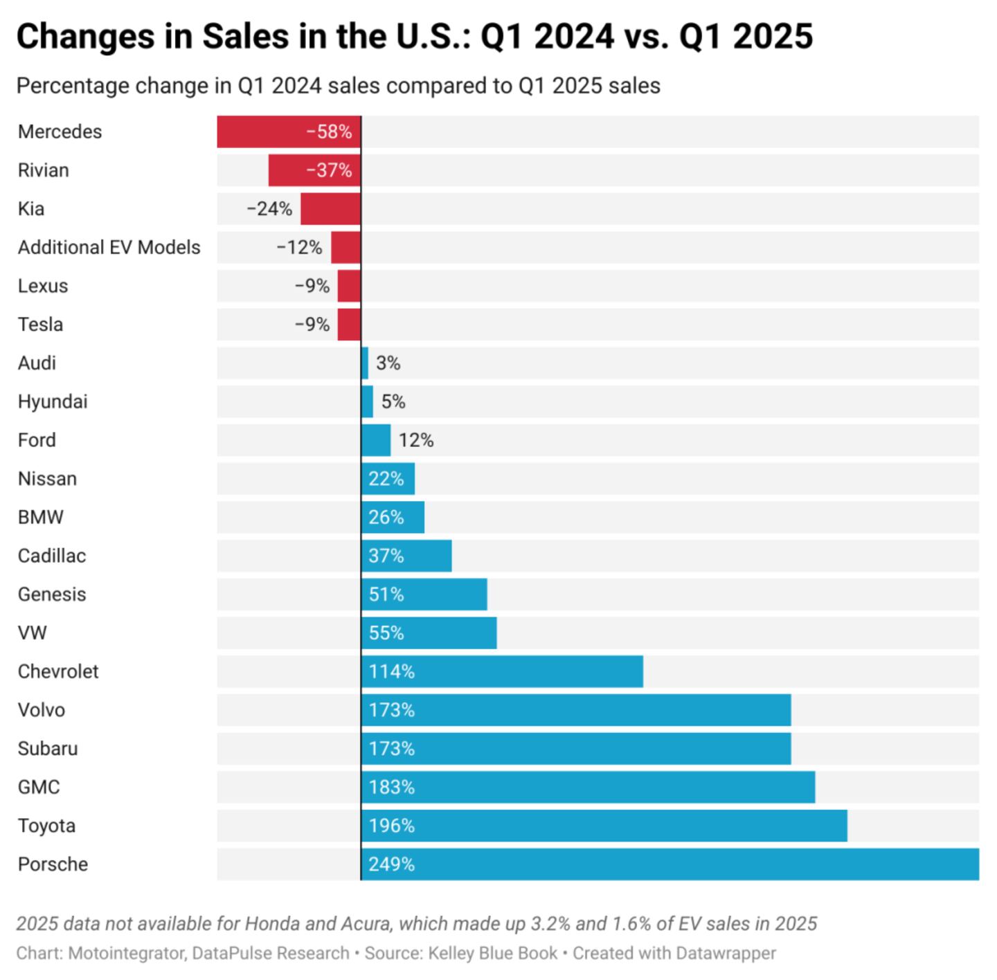 New data shows that Tesla’s decline is specific to its brand. In Q1 2025, Tesla’s U.S. sales dropped by 9% year-over-year, while competitors experienced substantial growth. Porsche (+249%), Toyota (+196%), GMC (+183%), and Volvo (+173%) led with triple-digit increases. Legacy automakers like Chevrolet (+114%), Ford (+12%), and Volkswagen (+55%), also outpaced Tesla.