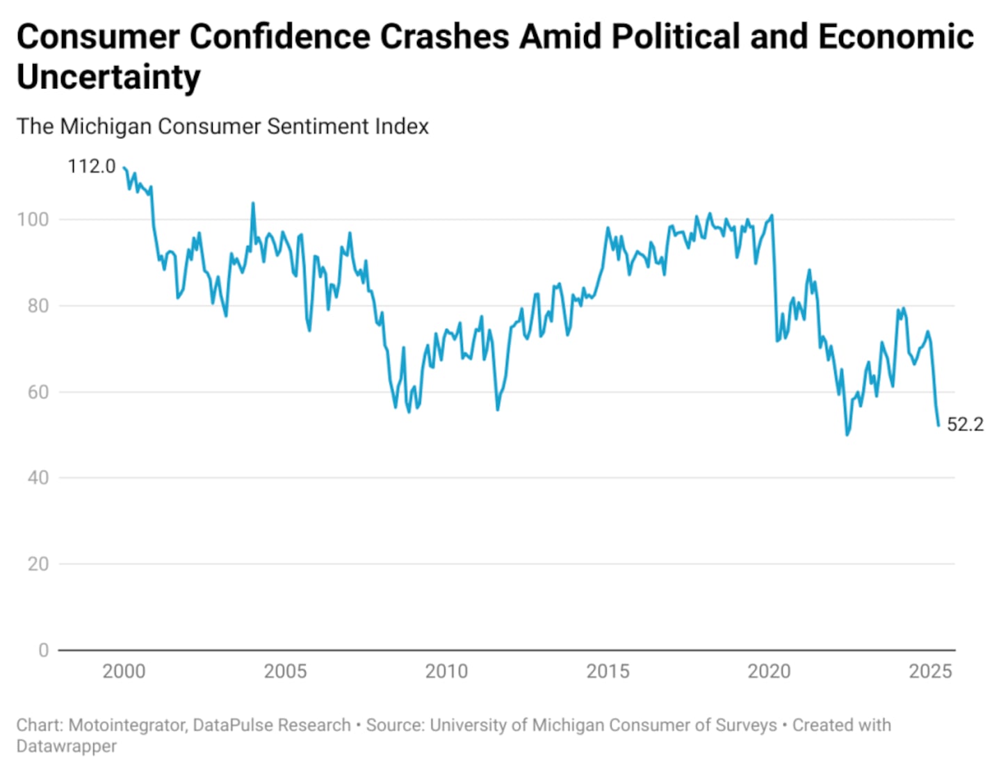 Musk’s economic agenda is being felt at the household level. According to the University of Michigan’s Consumer Sentiment Index, consumer sentiment has cratered to levels not seen since the peak of post-pandemic inflation, reflecting deep anxiety among households about personal finances, business conditions, unemployment, and inflation.
