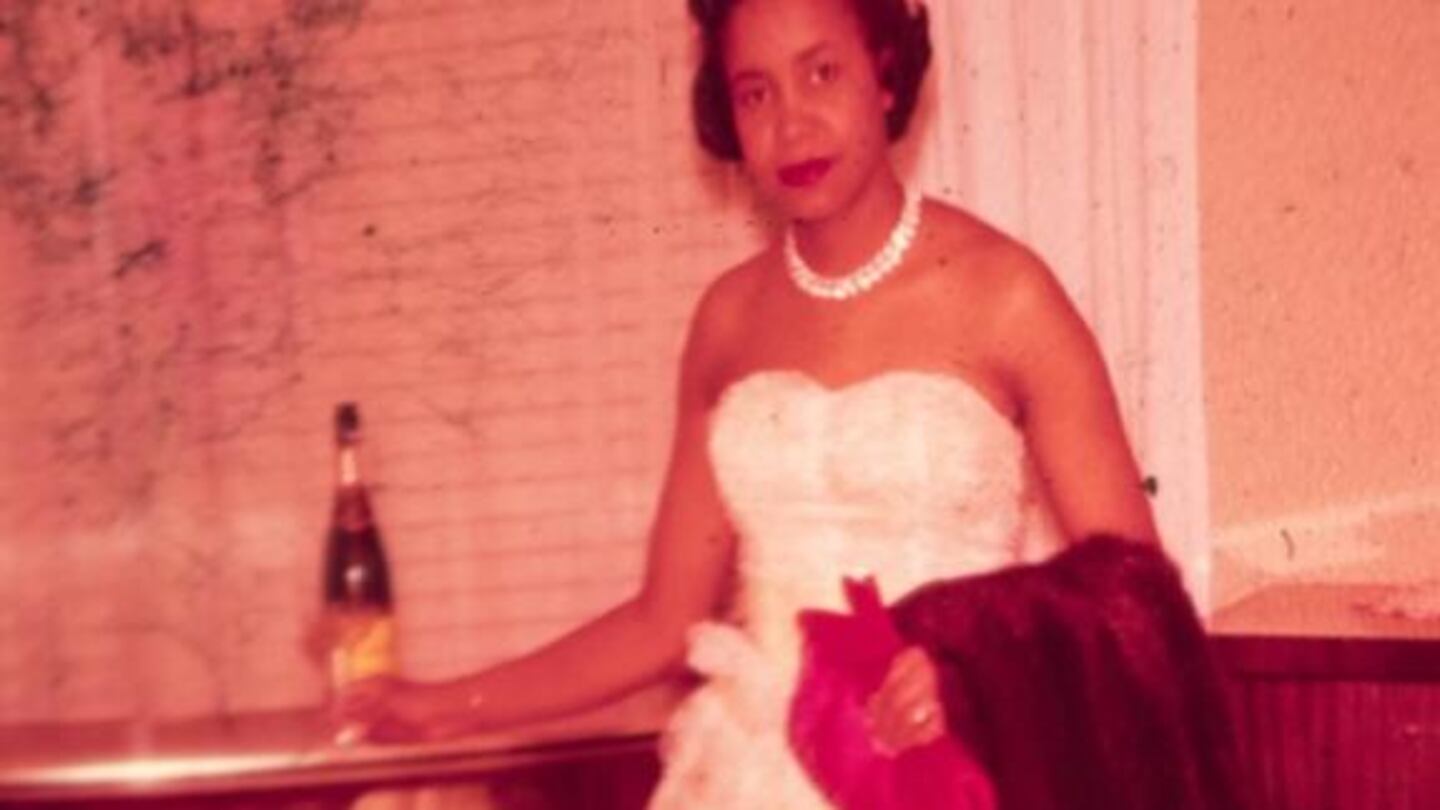 The lady of the house dazzles in a strapless evening gown, pink gloves and glittery choker. There's a champagne coupe in her right hand — Veuve Cliquot, it appears from the label behind her — and a mink stole drapes over her left arm. Where did she go that night?