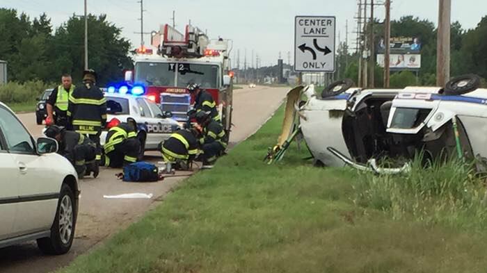 Patrolman Justin Thompson, of the Jonesboro Police Department, was flown by helicopter to a hospital in Memphis, Tennessee, after firefighters cut him out of his police car. He has since been treated and released, according to the Craighead County Sheriff's Office.