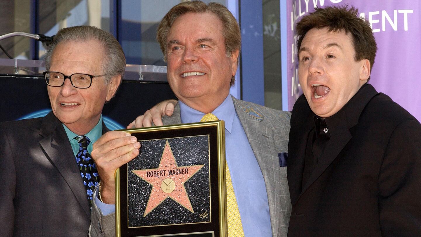 Actor Robert Wagner (C) poses with talk show host Larry King (L) and actor Mike Meyers at ceremony honoring Wagner with a star on the Hollywood Walk of Fame on July 16, 2002 in Hollywood, California.