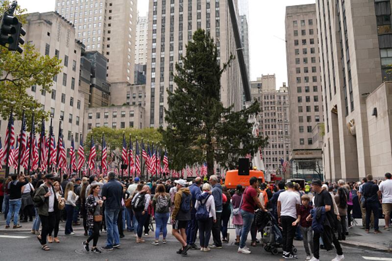 2022 Rockefeller Center Christmas tree arrives NEW YORK, NY - NOVEMBER 12: The Rockefeller Center Christmas tree was lifted into place after arriving in the plaza in New York City on Saturday, Nov. 12, 2022. About 100 spectators watched the lifting process of the 82-foot tall, 90-year-old Norway Spruce in the morning despite the rain. (Photo by Lokman Vural Elibol/Anadolu Agency via Getty Images) (Anadolu Agency/Anadolu Agency via Getty Images)