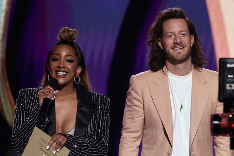 ACM Awards FRISCO, TEXAS - MAY 11: (L-R) Mickey Guyton and Tyler Hubbard speak onstage during the 58th Academy Of Country Music Awards at The Ford Center at The Star on May 11, 2023 in Frisco, Texas. (Photo by Theo Wargo/Getty Images) (Theo Wargo/Getty Images)