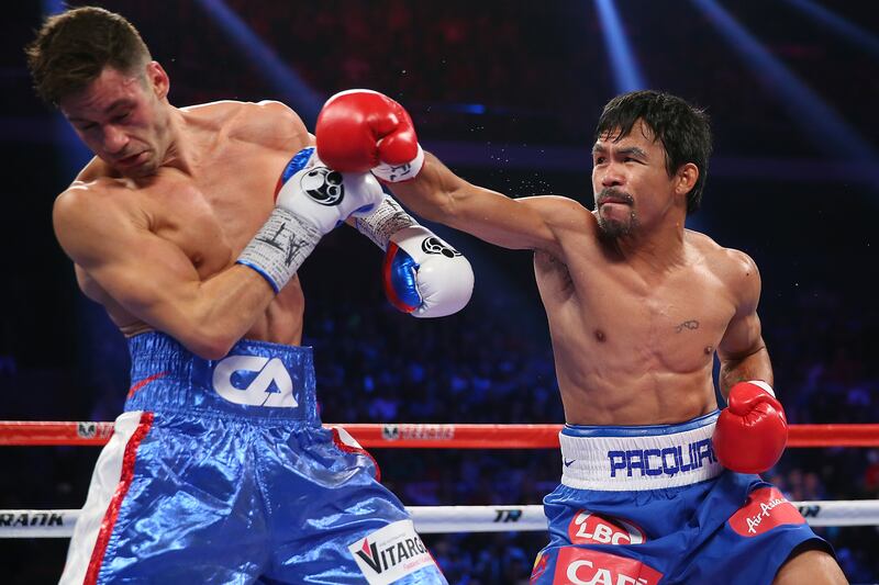 Photos: Manny Pacquiao through the years 2016: Manny Pacquiao (right) lands a left to the chin of Timothy Bradley Jr. during their welterweight championship fight on April 9, 2016, at MGM Grand Garden Arena in Las Vegas. Pacquiao won by unanimous decision. (Christian Petersen/Getty Images)