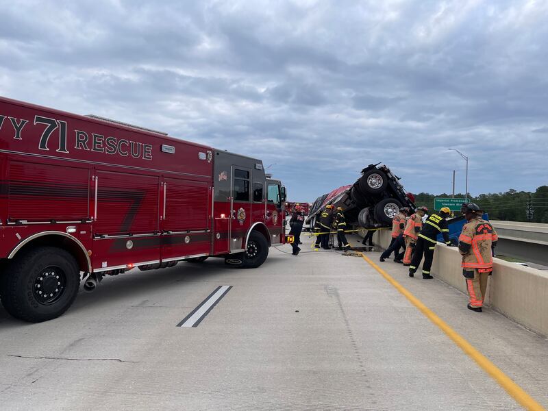 Truck crash Crash left 18-wheeler dangling off overpass. (Spring Hill Fire Department)
