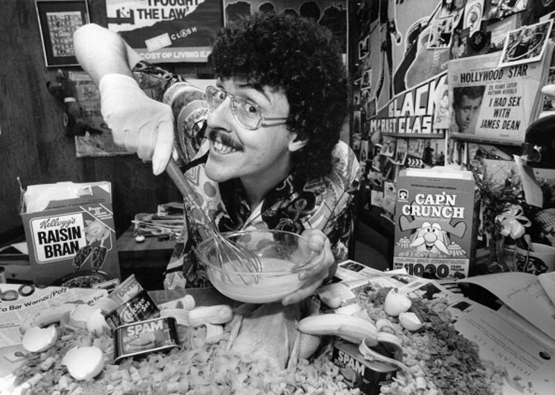 Photos: 'Weird Al' Yankovic through the years 1984: Portrait of American musician, parodist and comedian Weird Al Yankovic as he poses with various food items during a photo shoot, Los Angeles, California, March 20, 1984. The items, including boxes of cereal, Spam, bananas, a chicken and eggs in a bowl are all referenced in his song 'Eat It,' a parody of Michael Jackson's 'Beat It.' (Bob Riha Jr./Getty Images)