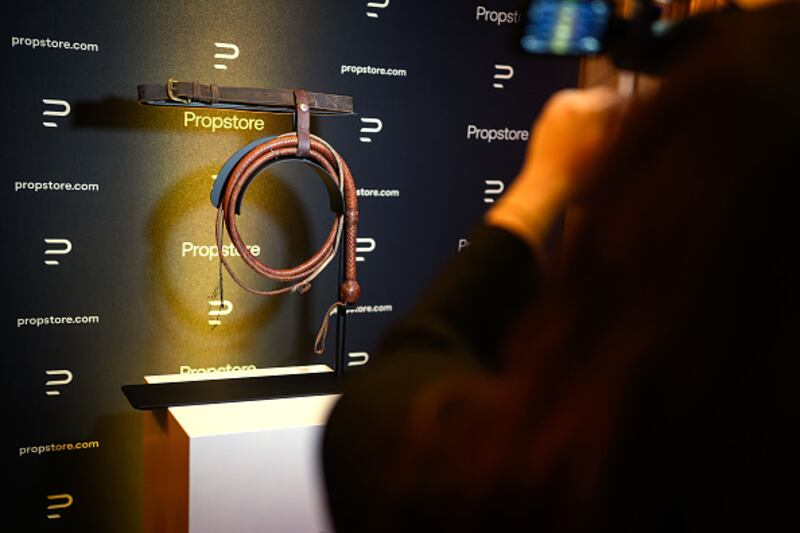 Propstore auction LONDON, ENGLAND - AUGUST 06: The belt and bullwhip (estimated sale price of $250,000-500,000) used by the character Indiana Jones in "Indiana Jones and Last Crusade" is displayed at a photocall ahead of an auction of entertainment memorabilia by Propstore, on August 06, 2025 in London, England. The bullwhip is among several iconic film memorabilia that will be going to auction in Los Angeles in September, alongside the screen-matched lightsaber prop, used by the character "Darth Vader" in the Star Wars films "The Empire Strikes Back and "Return Of The Jedi",' and Sauron's Helmet from, 'The Lord of the Rings.' (Photo by Leon Neal/Getty Images) (Leon Neal/Getty Images)