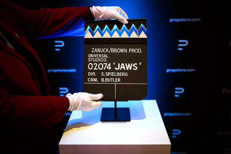 Propstore auction LONDON, ENGLAND - AUGUST 06: A shark tooth clapperboard with unique biting action from the film "Jaws" (1975), is displayed at a photocall ahead of an auction of entertainment memorabilia by Propstore, on August 06, 2025 in London, England. The clapperboard (estimated sale price of $40,000-$80,000) is one of a small amount produced and is among several iconic film memorabilia that will be going to auction in Los Angeles in September, alongside Indiana Jones' bullwhip and belt from 'Indiana Jones and the Last Crusade,' and Sauron's Helmet from, 'The Lord of the Rings.' (Photo by Leon Neal/Getty Images) (Leon Neal/Getty Images)