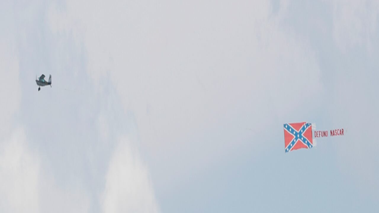 The flag and an accompanying message, “Defund NASCAR,” were not affiliated with the organization. It’s unclear who sponsored the aerial advertising.