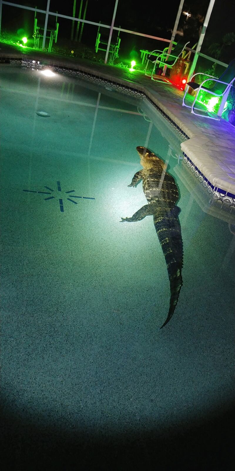 The Charlotte County Sheriff’s Office shared photos of the large reptile in a Facebook post, joking, “Water Safety Month, Tip #37: Always check your pool before diving in!”