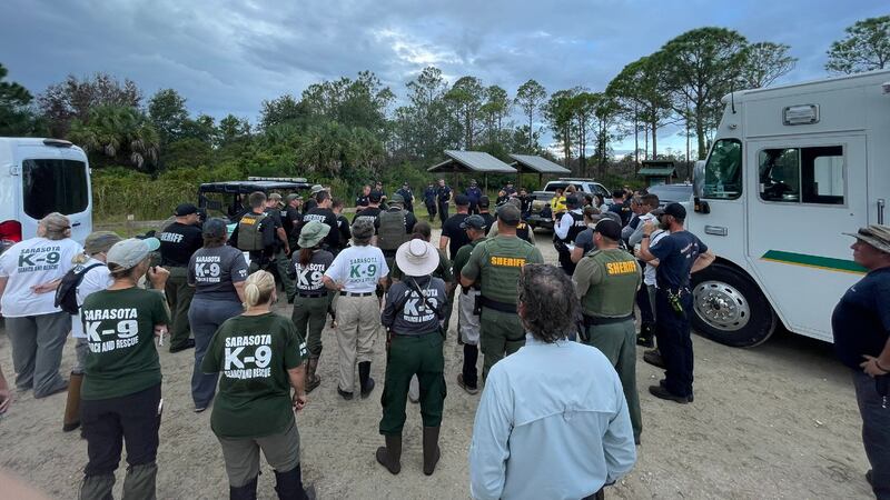 Brian Laundrie search Authorities in Florida gather to search the Carlton Reserve in Sarasota County on Wednesday, Sept. 21, 2021, for signs of Brian Laundrie, the fiance of Gabrielle "Gabby" Petito. Family members said Laundrie was last seen Tuesday, Sept. 14, 2021. He was named a person of interest in Petito's death after an autopsy on Tuesday, Sept. 21, 2021, confirmed her remains had been found in Wyoming. (North Port Police Department)