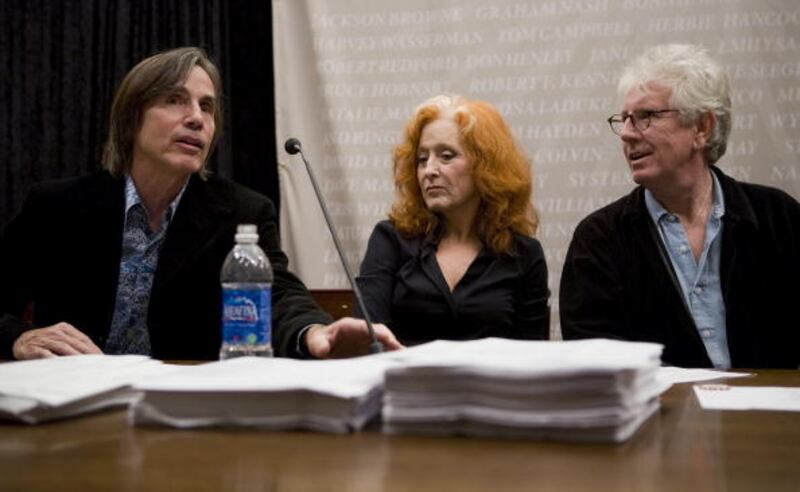Photos: Graham Nash through the years 2007: Bonnie Raitt (center) and Graham Nash (right) listen to Jackson Browne (left) speak during a news conference on Capitol Hill on October 23, 2007, in Washington, D.C. (Brendan Smialowski/Getty Images)