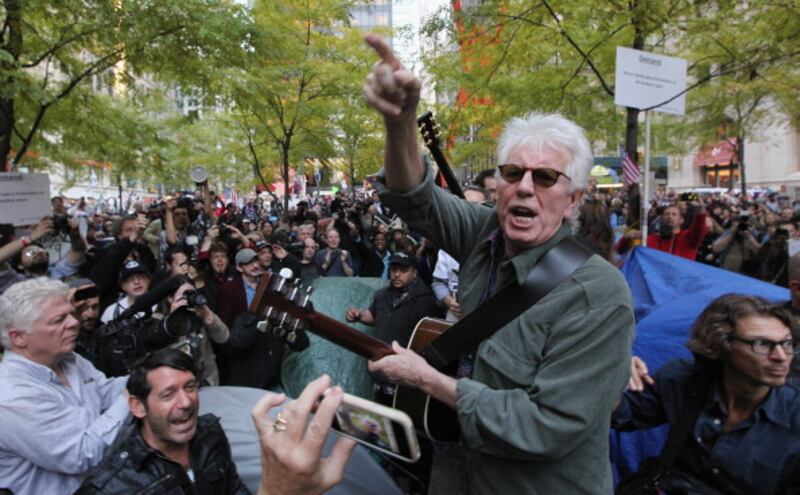 Photos: Graham Nash through the years 2011: Musician Graham Nash (second from right) yells to the crowd after he and David Crosby played an acoustic set for members of Occupy Wall Street in Zuccotti Park on November 8, 2011, in New York City. (Mario Tama/Getty Images)