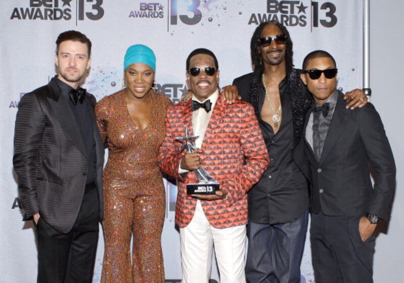 Photos: India Arie through the years 2013: Musicians Justin Timberlake, India Arie, BET Lifetime Achievement Award recipient musician Charlie Wilson, rapper Snoop Lion (formerly Snoop Dogg) and Pharrell Williams in the Backstage Winner's Room at Nokia Theatre L.A. Live on June 30, 2013, in Los Angeles. (Mike Windle/Getty Images for BET)