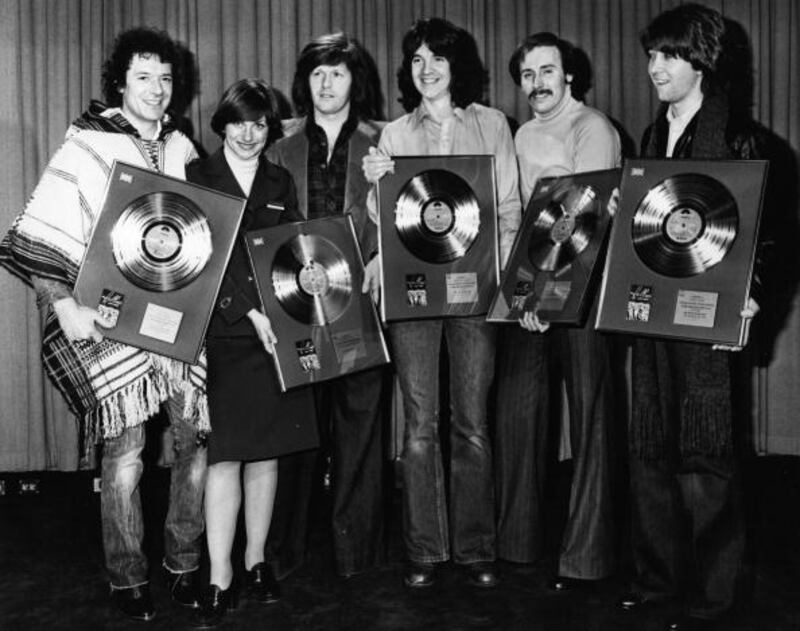 Photos: Graham Nash through the years 1977: Pop group The Hollies and a friend hold gold disc awards presented to them for record sales. From left to right, Allan Clarke, unknown, Bobby Elliot, Graham Nash, Tony Hicks and Eric Haydock. (Evening Standard/Getty Images)