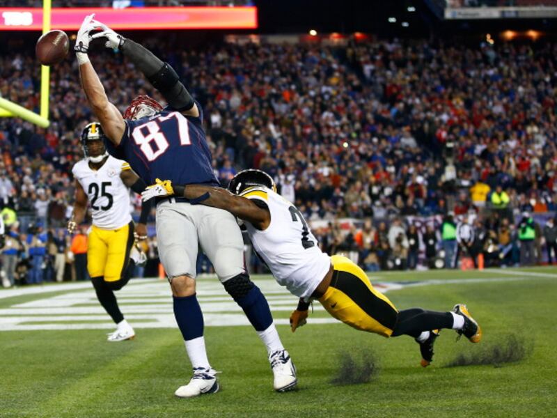 Through the years FOXBORO, MA - NOVEMBER 03: Rob Gronkowski #87 of the New England Patriots misses catching a touchdown pass in front of Shamarko Thomas #29 of the Pittsburgh Steelers in the second quarter at Gillette Stadium on November 3, 2013 in Foxboro, Massachusetts. Pass interference was called on the play. (Photo by Jared Wickerham/Getty Images) (Jared Wickerham/Getty Images)